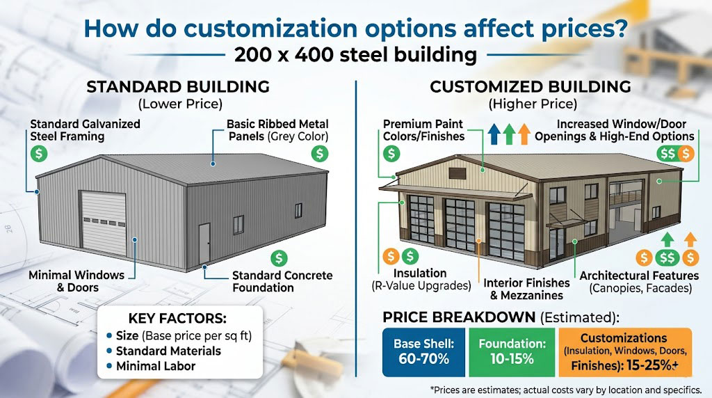 Customization options increase your total spend by 10% up through 30% depending upon your selections. Modifying standard designs directly impacts your overall 200 x 400 steel building price. Adding features like mezzanines, crane runways, or specialized exterior finishes requires extra engineering plus materials. These upgrades customize a facility exactly for your specific operational needs.