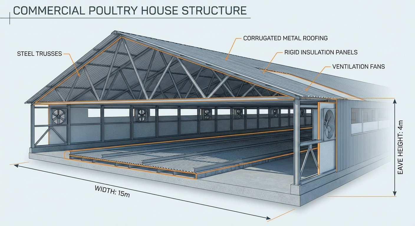 Modern commercial chicken houses utilize steel frames to ensure a lifetime of structural stability and pest resistance.