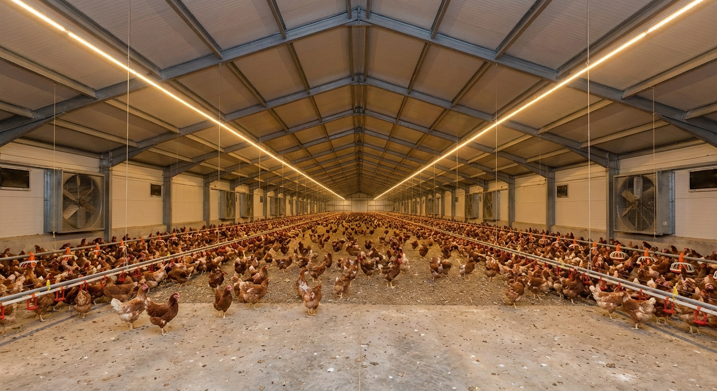 Lighting in a commercial chicken house represents a large portion of electrical costs and directly affects bird digestion. Much like a high-tech workshop , the lighting layout must be consistent to ensure even bird distribution. You should implement a period of darkness to improve feed efficiency and reduce the incidence of metabolic disorders.