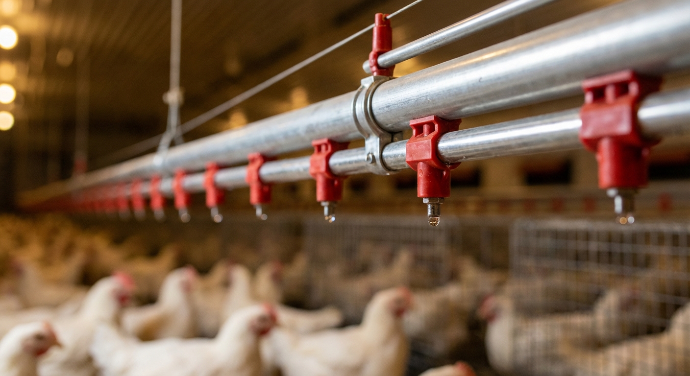 A closed drinker system in a commercial chicken house is a significant improvement over open troughs or bell drinkers. These nipple-based systems prevent water contamination and keep the litter drier, which is essential for maintaining bird health. Most producers prefer low-flow nipple drinkers that dispense water only when the birds peck at the trigger.