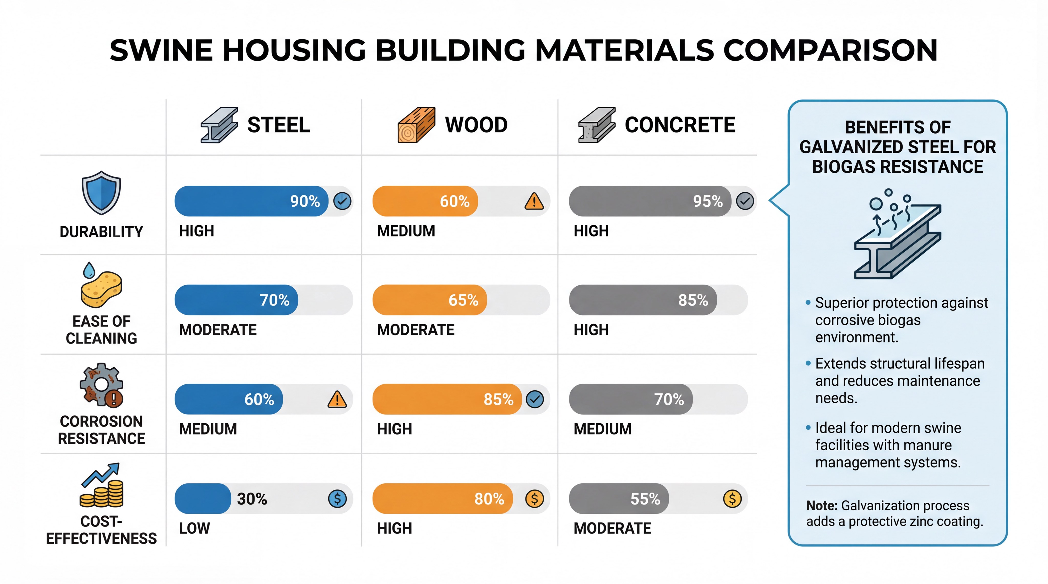 You must consider that pig manure produces corrosive biogas that can eat through standard building materials. Galvanized components, including tie bars and bolts, are essential to prevent this type of chemical decay. This choice protects your investment from the inside out.