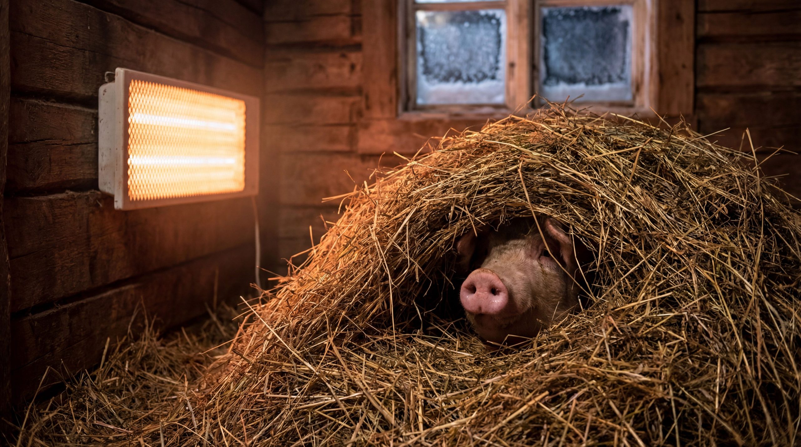 You must avoid heat lamps because they are a major fire hazard in barn settings. Instead, opt for safer ceramic heating panels or simply ensure the pigs have a buddy to snuggle with.