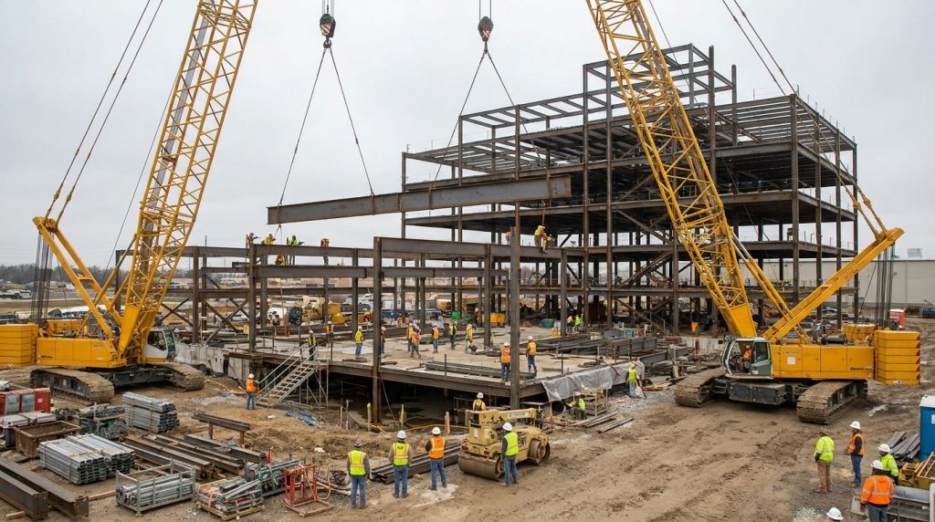 How does the construction timeline compare to wood? Steel is much faster because the components arrive pre-cut and pre-drilled, allowing a 20,000-square-foot shell to be erected in weeks rather than months.