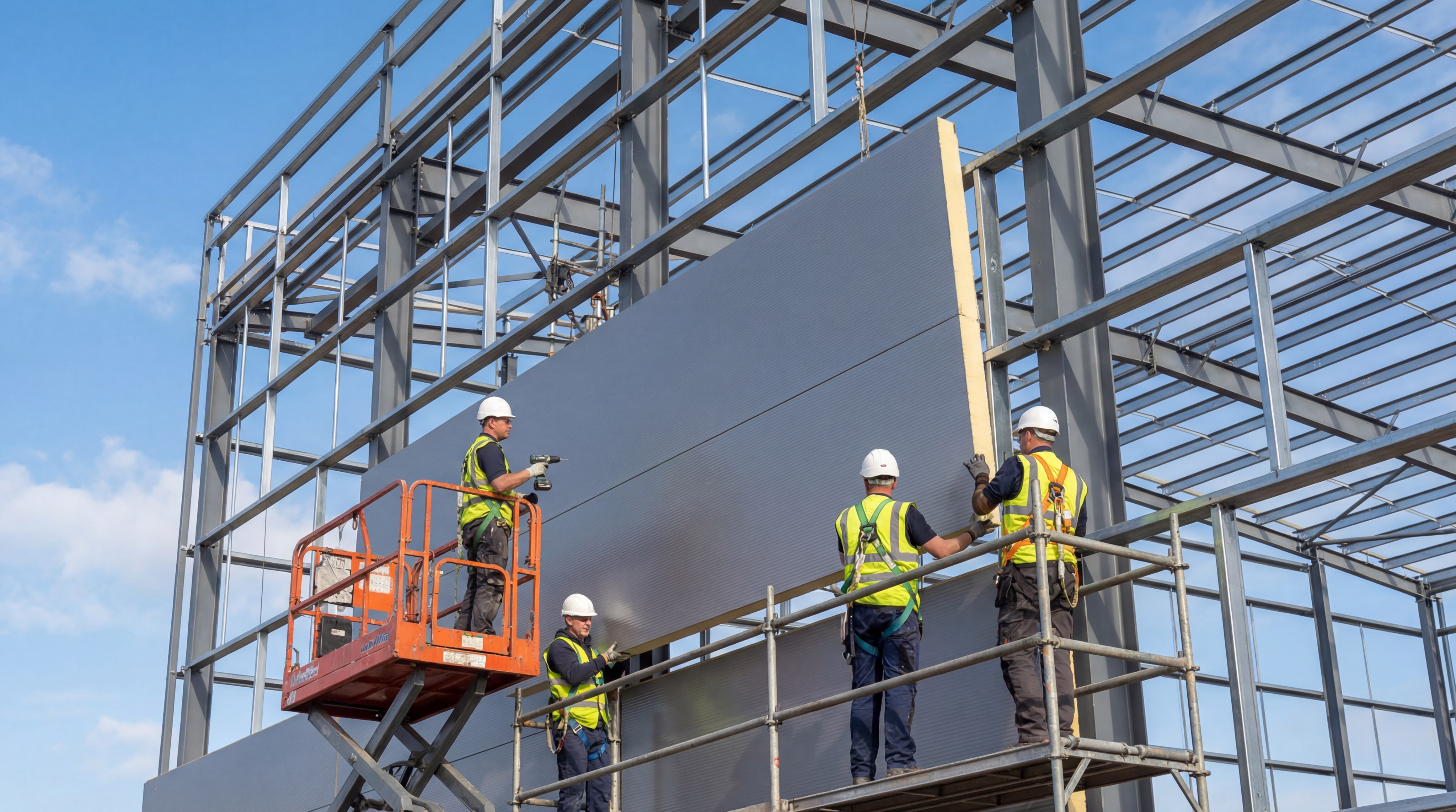 - Cladding: Attaching the insulated sandwich panels or steel sheets.