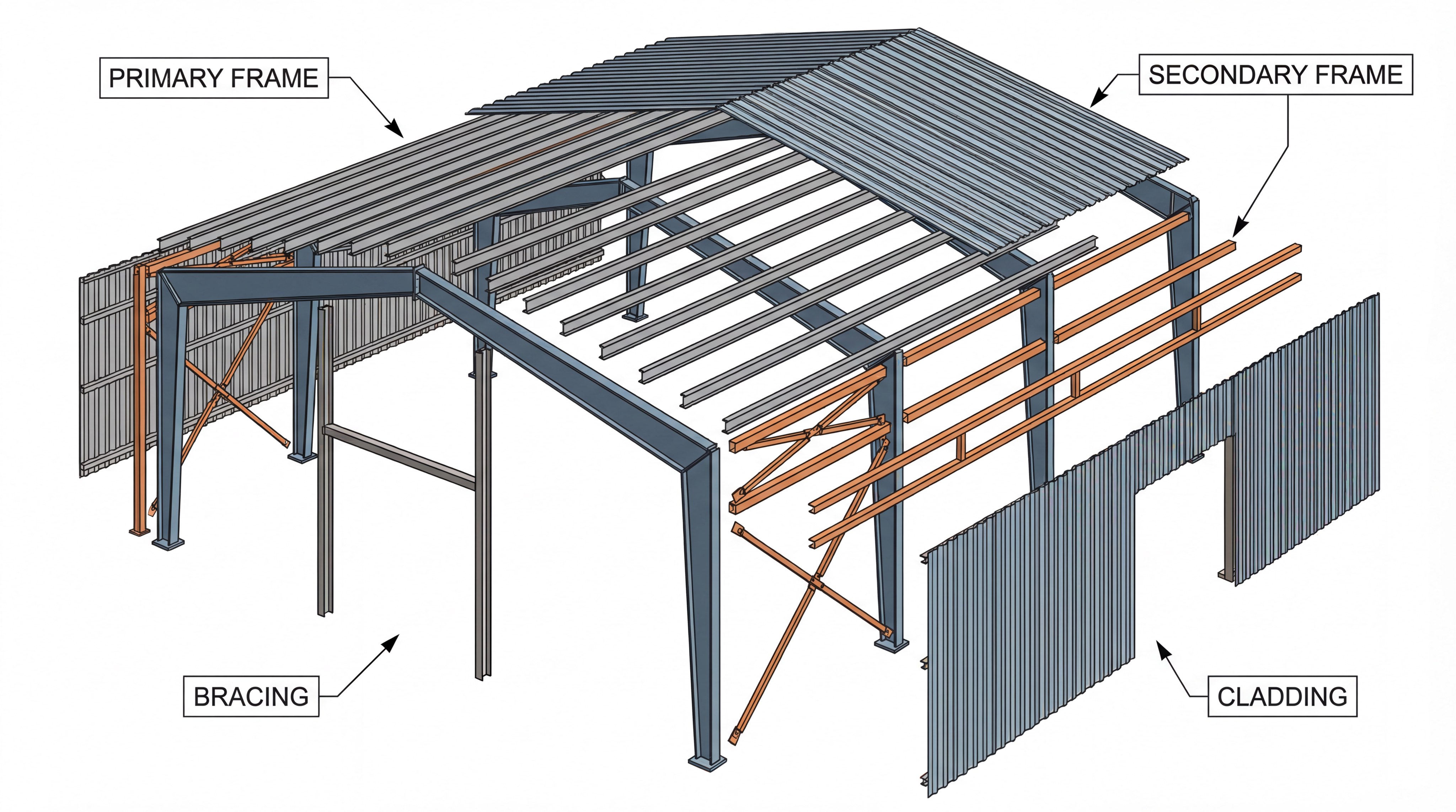 - Secondary Frame: Consists of C or Z-shaped purlins and girts.