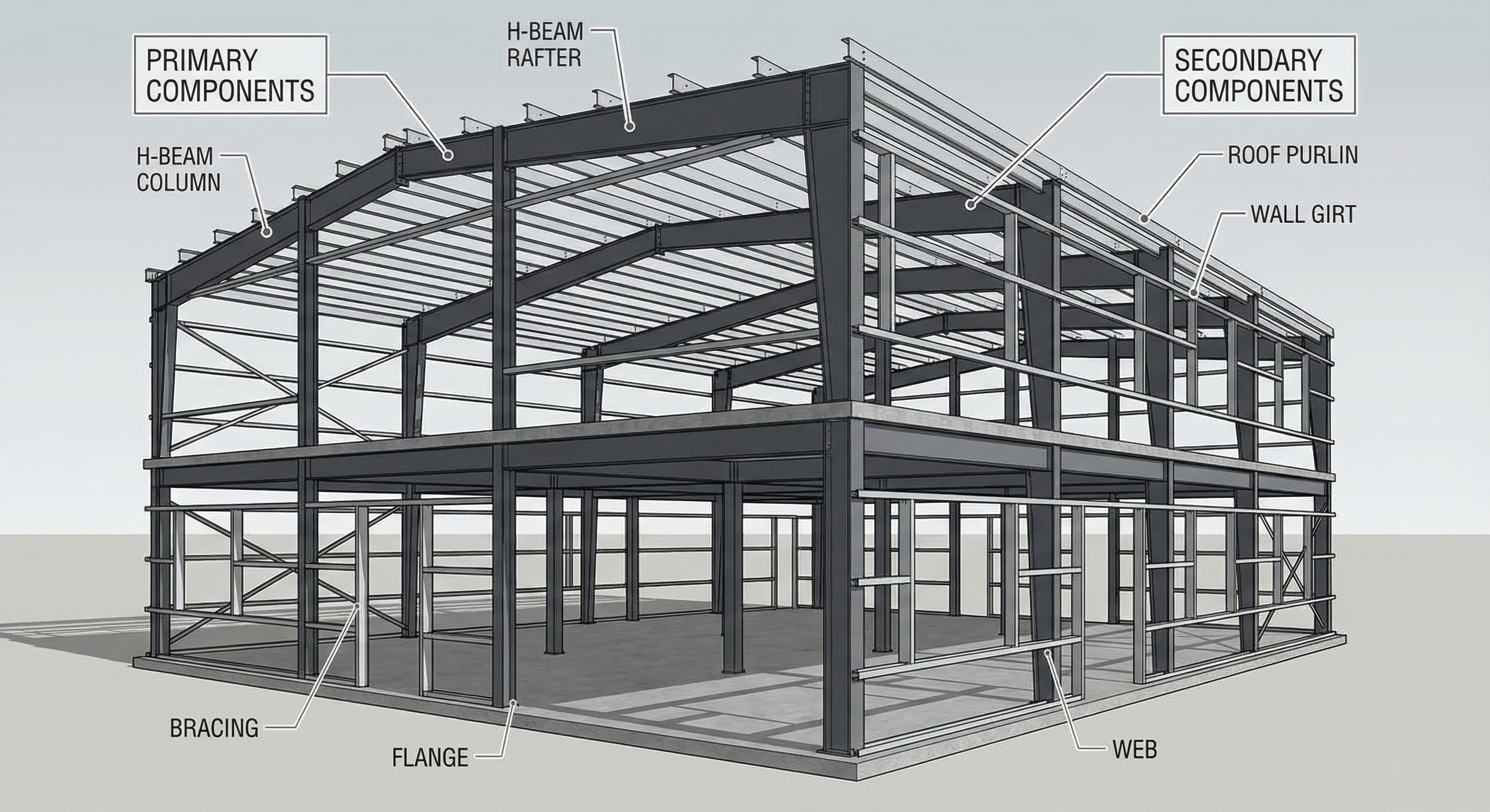 The primary frames are usually made of heavy H-beams that form the main portals of the building. You can think of these as the main arches that provide the height and width of your facility.