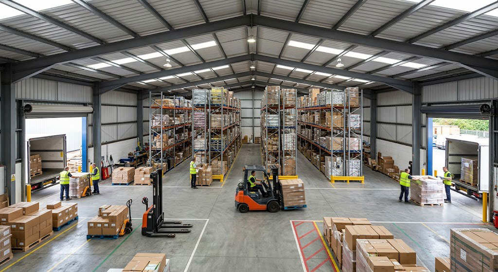 Dedicated incoming receiving zones prevent messy shipments from mixing alongside outgoing outbound packages. Wide overhead roll-up doors allow massive delivery trucks sufficient operational clearance during unloading procedures. Strategic interior architectural planning transforms an empty metal shell into a highly productive logistical hub.