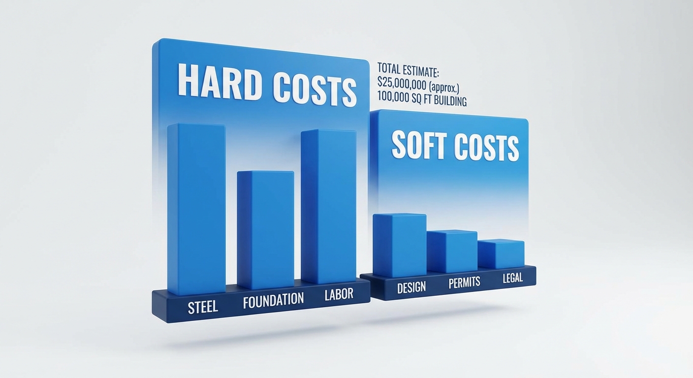 Soft costs for a 100,000 square feet building usually account for 20% to 30% of the project budget and include design, legal, and permitting fees. These intangible expenses are often overlooked but are essential for moving the project from concept to reality. You must prepare for professional fees for architects, structural engineers, and environmental consultants.