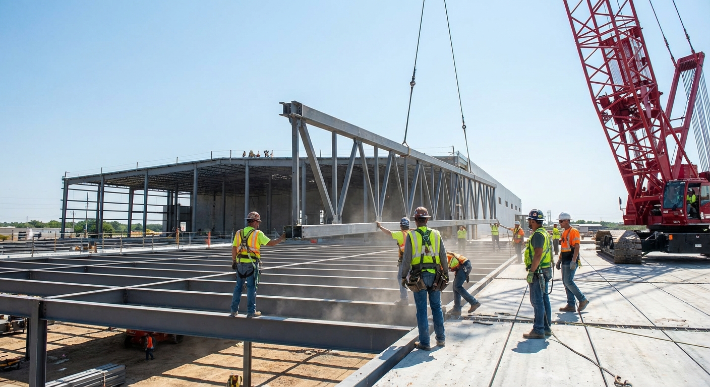 Because steel buildings are pre-engineered, the labor hours required are significantly lower than those for wood or masonry projects. However, the scale of this facility requires substantial mechanical assistance.