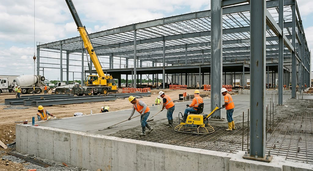 What’s the best foundation for a heavy-duty commercial facility? A reinforced concrete slab is absolutely the best choice. This foundation safely supports heavy machinery, towering storage racks, and the immense structural weight of the building itself.
