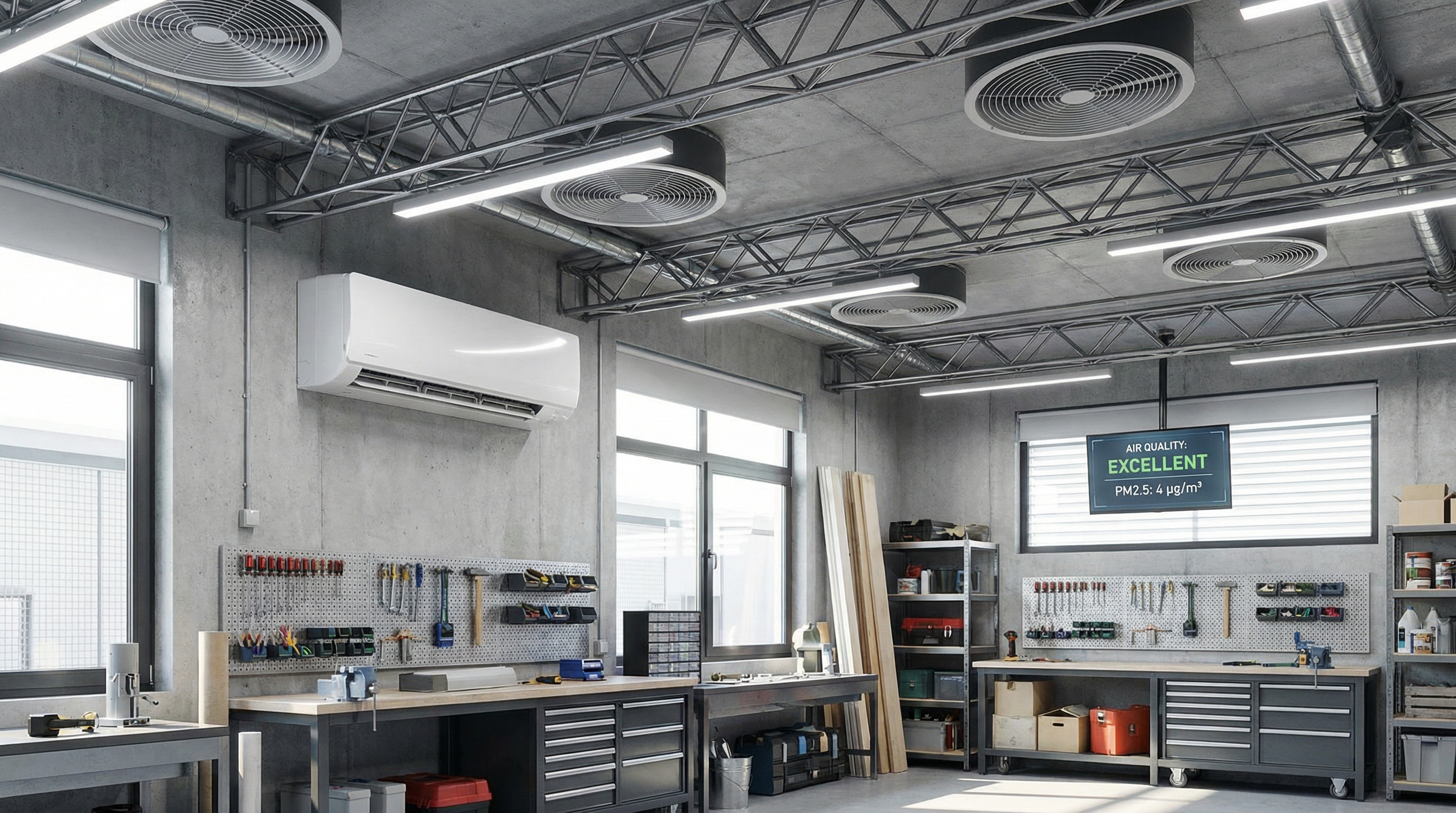 Finishing work requires consistent airflow to exhaust fumes and ensure coatings dry without dust contamination. High-efficiency air filtration units that hang from the ceiling can scrub the air of the microscopic particles that standard collectors miss. This is especially important in basement or attached garage shops where air can migrate into the living area.