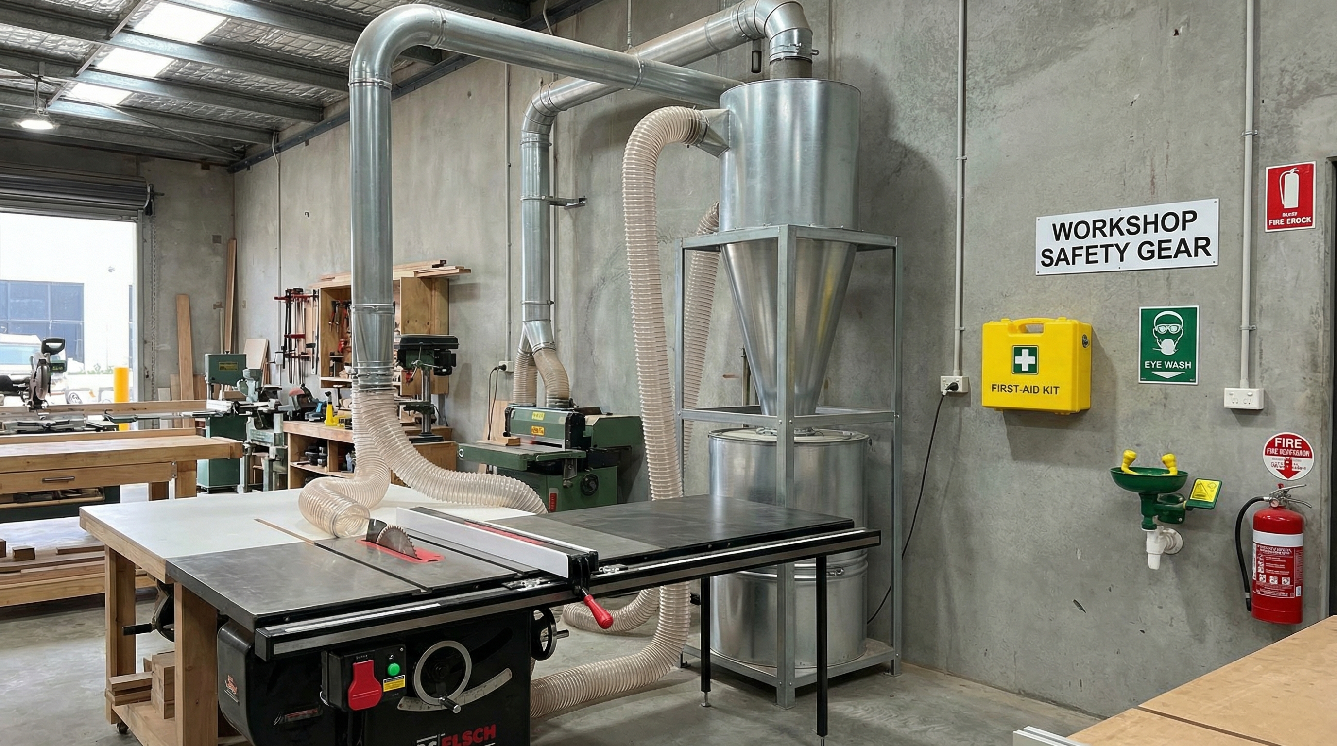 Clean air is essential for both project quality and long-term health. Fine sawdust is both a respiratory hazard and a fire risk, making a central dust collector with hard-piped runs a necessity. These systems pull debris directly from the source before it has a chance to settle on your surfaces or enter your lungs.