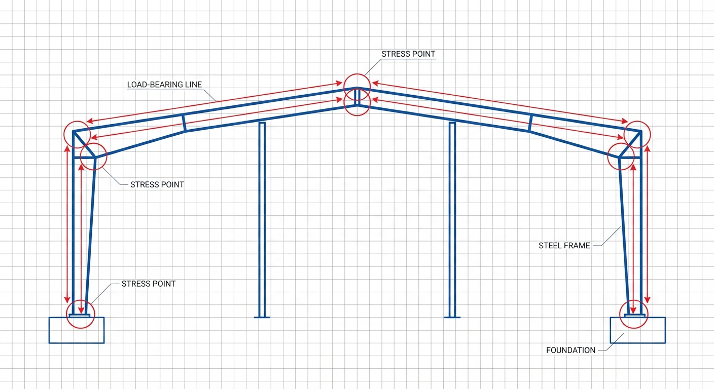 Stress points usually occur at the joints where columns meet the rafters. The diagram uses color-coding to show where the steel might experience the most tension or compression.