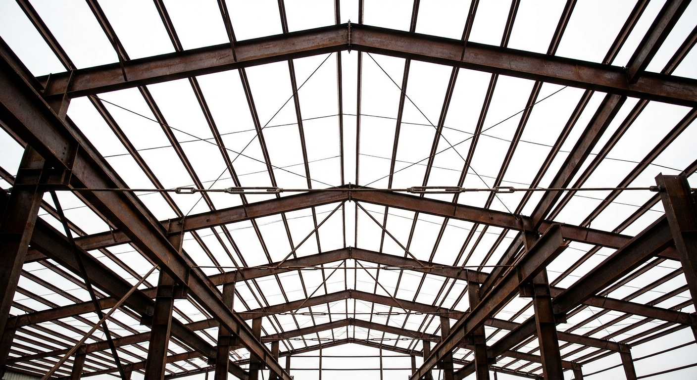 X-bracing and tie rods act like the “muscles” of the building, resisting wind forces that hit the side of the warehouse. Without them, the building could sway dangerously.