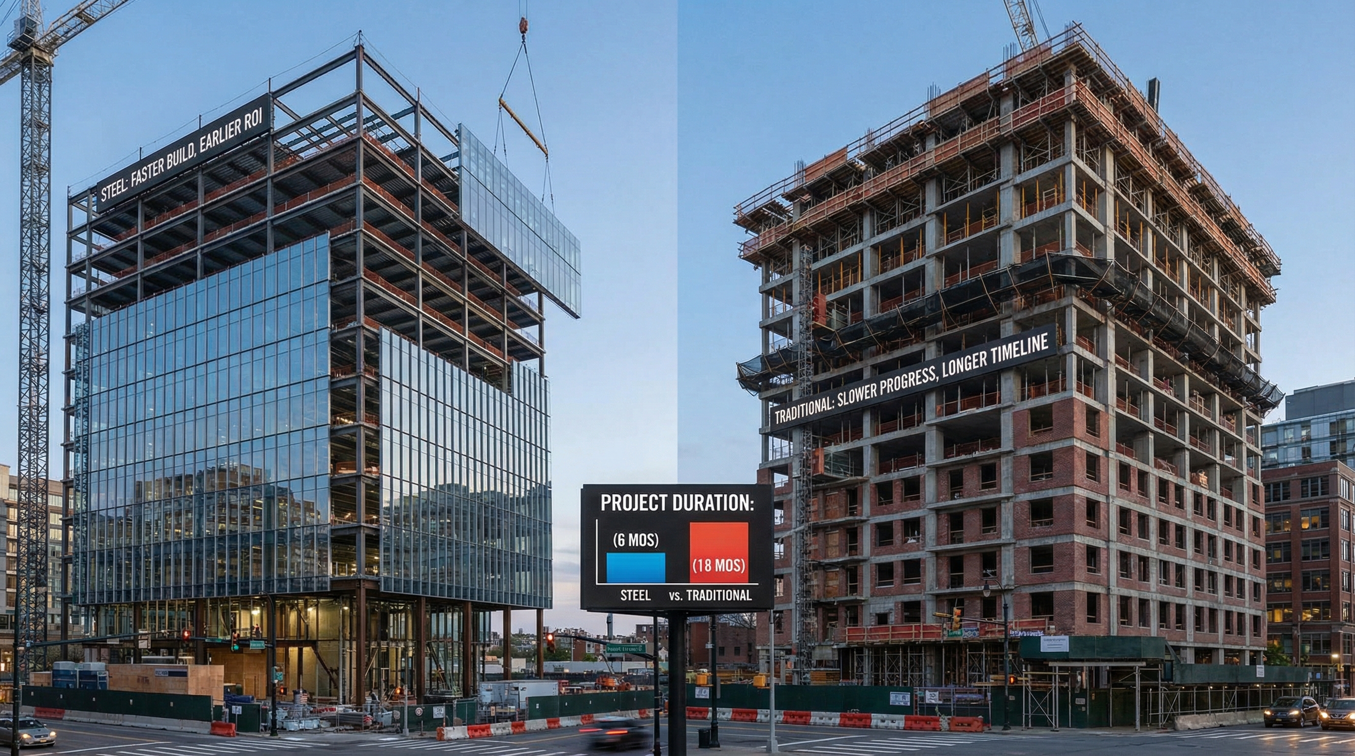 Key Takeaway: Speed of erection is one of steel’s greatest competitive advantages, directly impacting project profitability and financing costs.