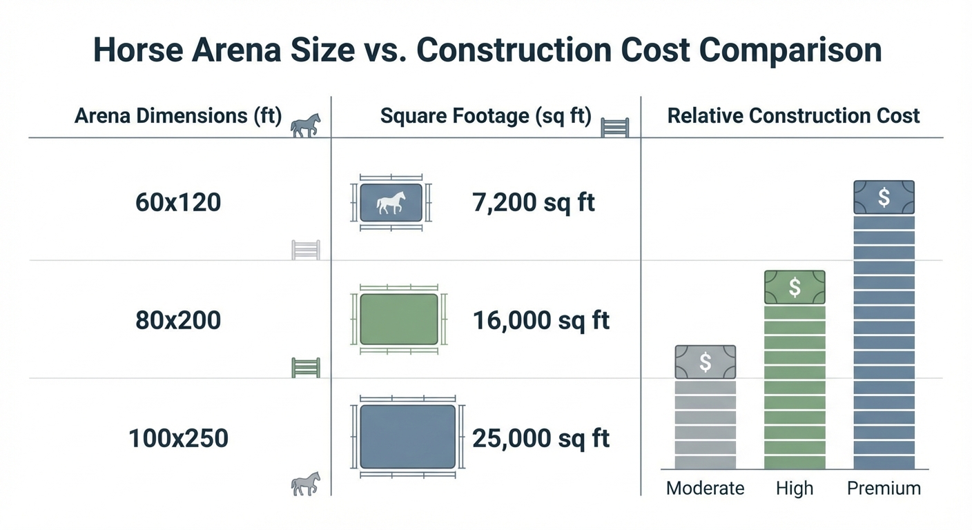 Key Takeaway: If your budget allows, opting for an 80′ x 200′ or larger footprint future-proofs your facility against changing riding needs and market demands.