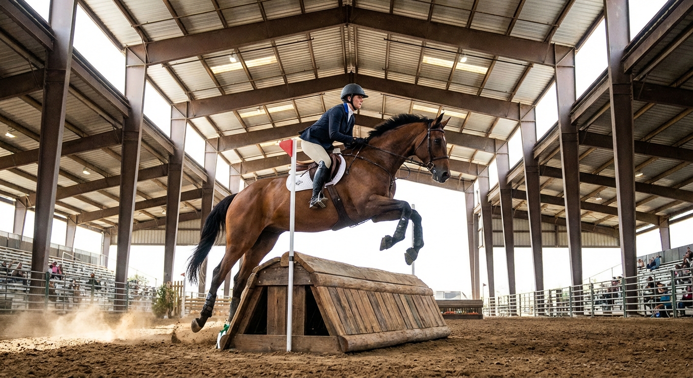 Key Takeaway: Jumping facilities require more horizontal and vertical volume than flatwork barns to ensure both the horse’s stride and the rider’s safety are never compromised.