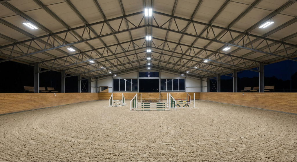 Larger standard horse arena size layouts require a more complex lighting plan to eliminate “spook-inducing” shadows and dark corners. As the distance between the walls and the center of the arena increases, you need a higher density of high-bay LED fixtures to maintain uniform illumination. Poor lighting can cause horses to shy or misjudge the distance to a jump, creating a significant safety risk.